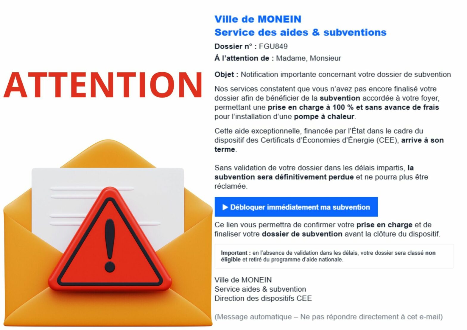 - La Ville de Monein n’envoie jamais de messages relatifs à des « prises en charge », « dossiers énergie » ou « subventions pompe à chaleur » depuis des adresses privées ou commerciales.