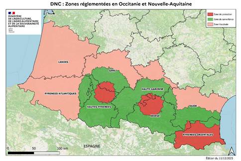 Face à la dégradation soudaine de la situation sanitaire, des actions renforcées pour éradiquer la maladie viennent compléter cette zone. La Ministre chargée de l’agriculture a décidé d’étendre le dispositif de lutte en instaurant une zone vaccinale complémentaire à celle déjà existante en zone réglementée. La vaccination couvrira ainsi l’intégralité des communes du département des Pyrénées-Atlantiques, ainsi que les Landes, l’Aude, la Haute-Garonne, et le Gers.La vaccination en zone réglementée est prioritaire.