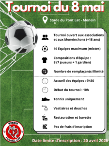 Message du MFC (Monein Football Club)« L’édition 2026 de notre tournoi « Jeannot Bert » se tiendra le 8 mai 2026 au stade du Pont Lat, cette année il sera ouvert aux associations […] En savoir plus MFC > Inscription tournoi du 8/05