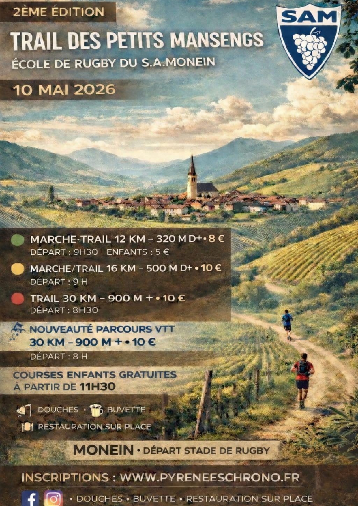 Stade Fernand Laurouaa Chemin de La Lannes, MONEINL’école de rugby du SA MONEIN a le plaisir de vous annoncer que la 2nde édition du TRAIL DES PETITS MANSENGS aura lieu le dimanche 10 mai 2026. Venez vous […]