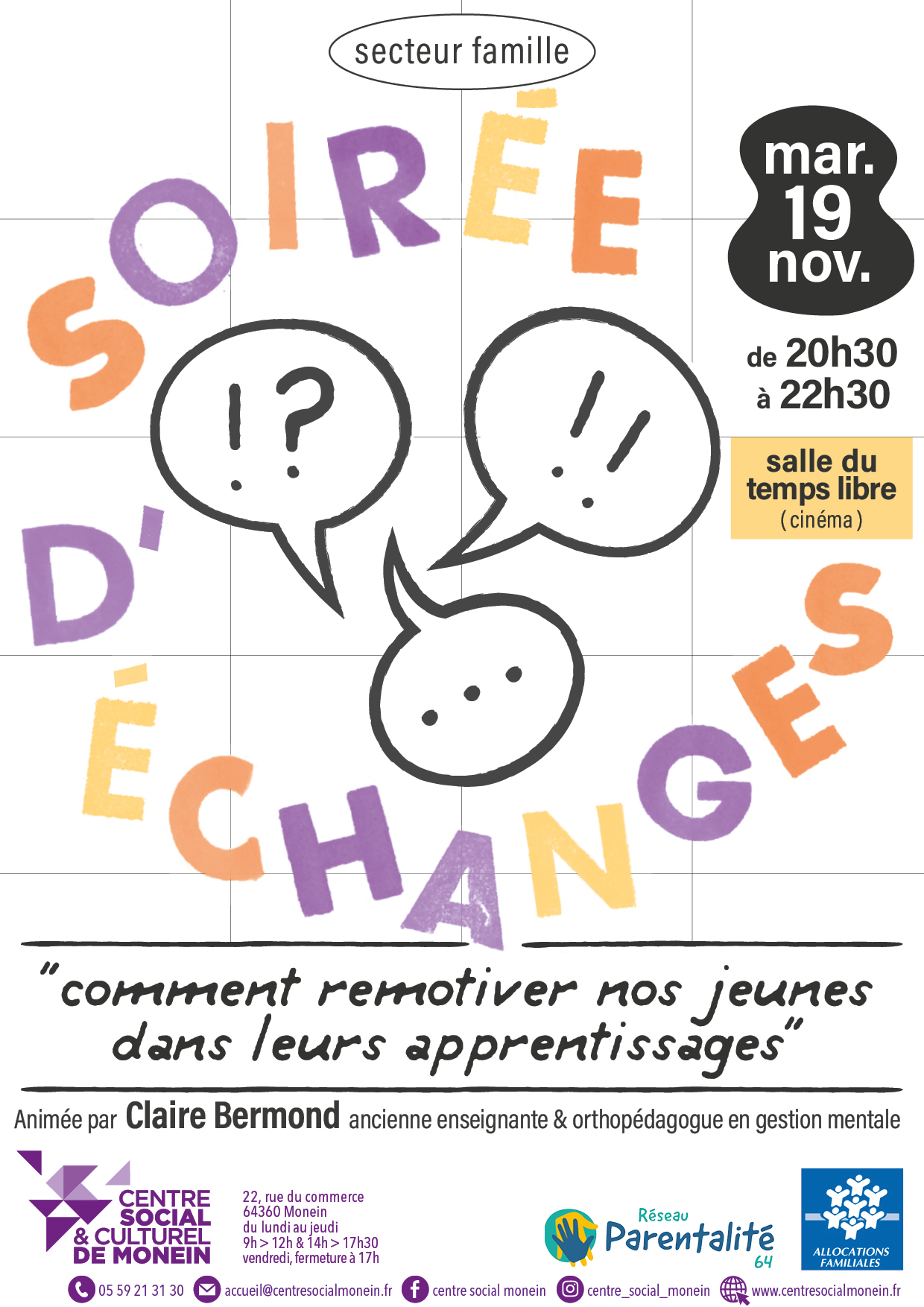 Le Centre Social organise une soirée d'échange sur la thématique "Comment remotiver nos jeunes dans leurs apprentissages?". Cette conférence sera animée par Claire Bermond, ancienne enseignante et aujourd'hui orthopédagogue en […]